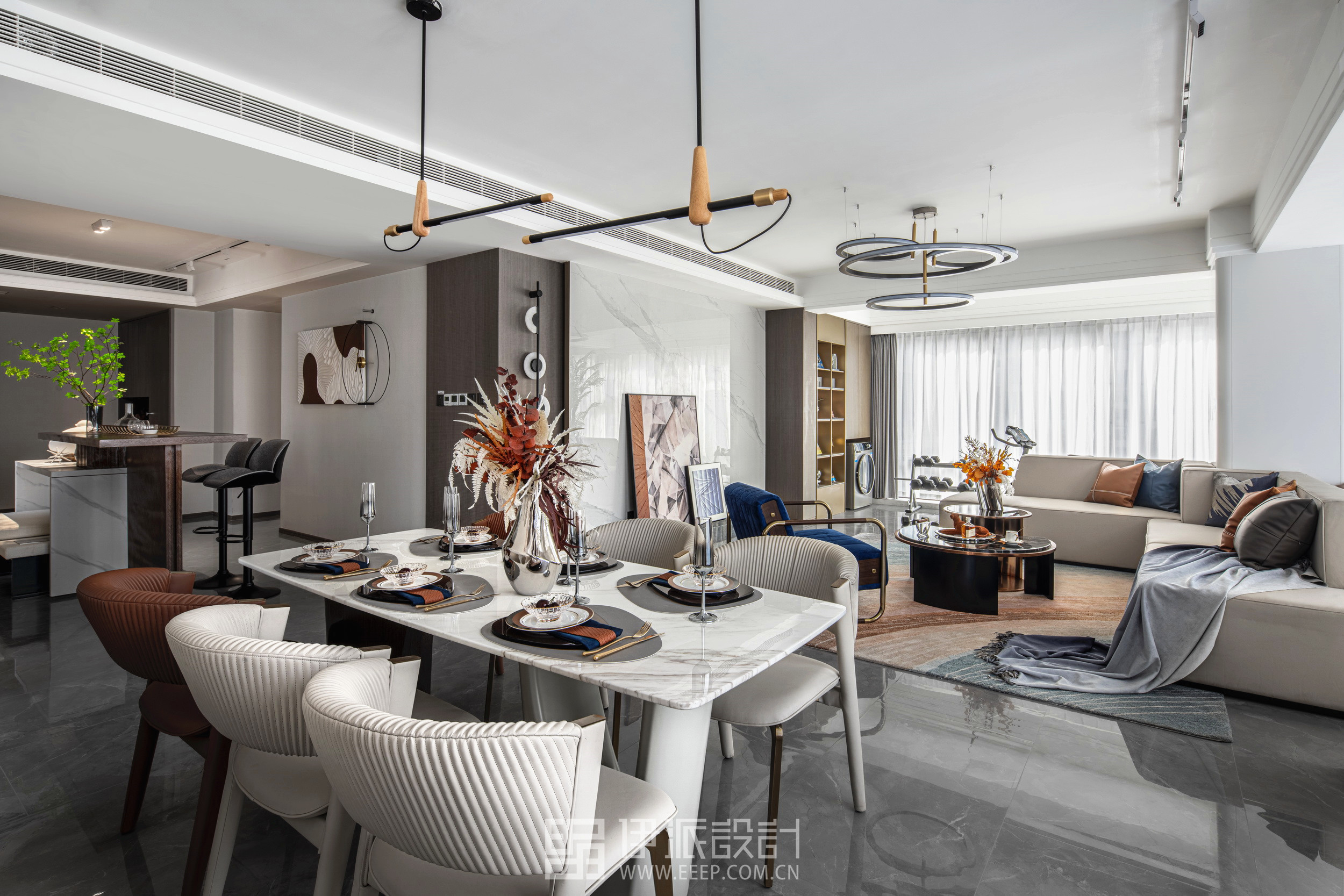 優(yōu)雅的格調(diào)、輕奢的品質(zhì)、當(dāng)代的藝術(shù),在空間之中交匯,在線型構(gòu)建與元素重構(gòu)下,經(jīng)由疏密有致的各類材質(zhì)組合,使得空間煥發(fā)出別具一格的光彩。